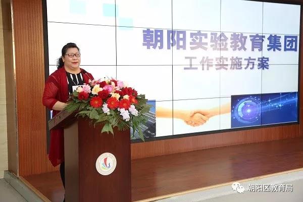 接着,朝阳实验教育集团总校长张玉英宣读了《朝阳实验教育集团工作实施方案》,介绍了朝阳实验教育集团发展的“开放、共享、合作、共赢”原则,将积极探索学校管理、教师发展、学生成长、质量提升等方面管理策略,通过“五联”实现“三促”,即两个校区通过理念联通、课程联建、师生联动、品牌联创、效应联升,促进教师队伍专业化成长,促进学生综合素质提升,促进学校办学水平提高。