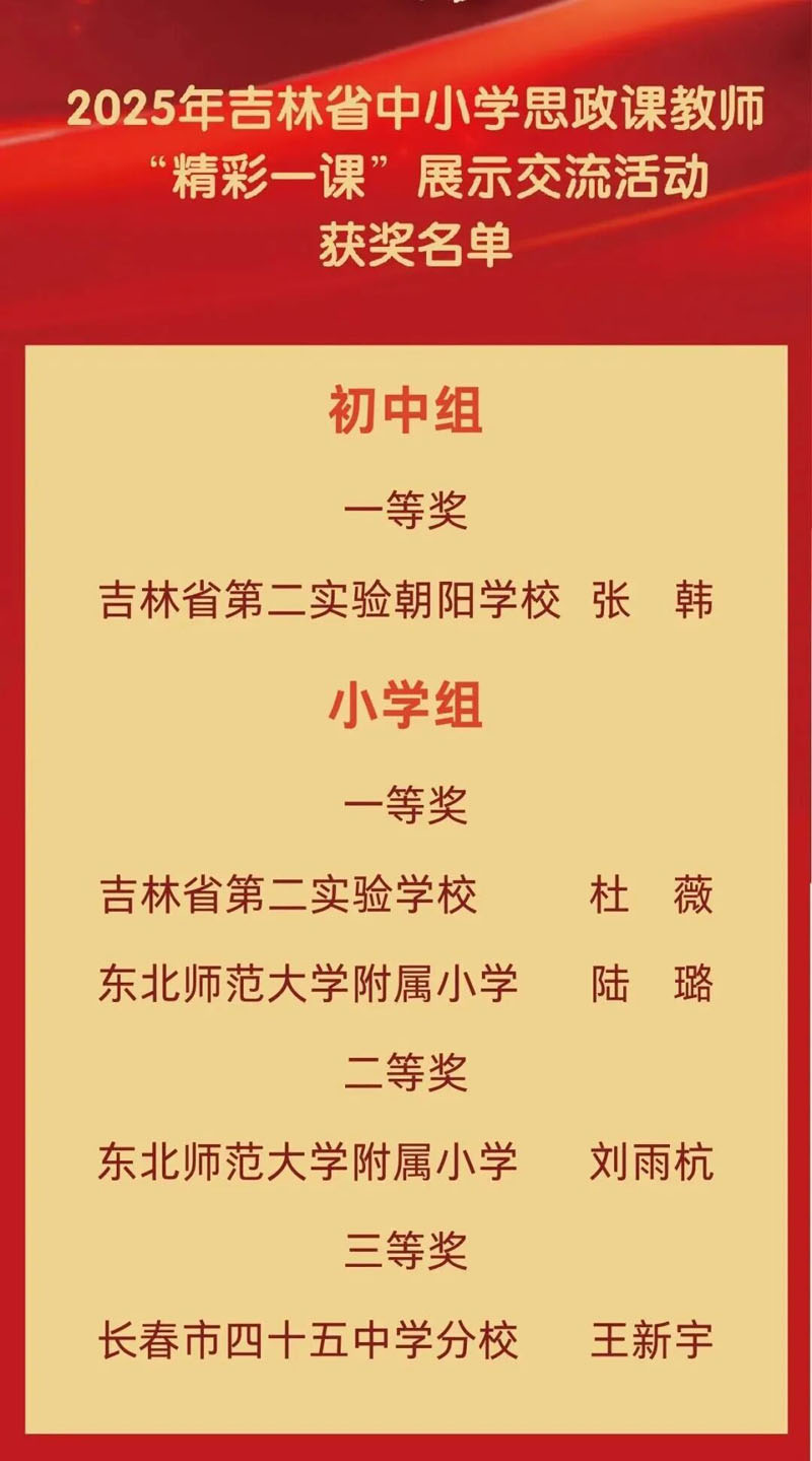 2名教师入选2025年吉林省中小学校思想政治理论课教师“年度影响力人物”,5名教师在全省中小学思政课教师“精彩一课”展示活动中斩获佳绩,以优质成果推动思政课教学提质增效。