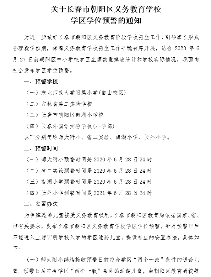 关于长春市朝阳区义务教育学校学区学位预警的通知