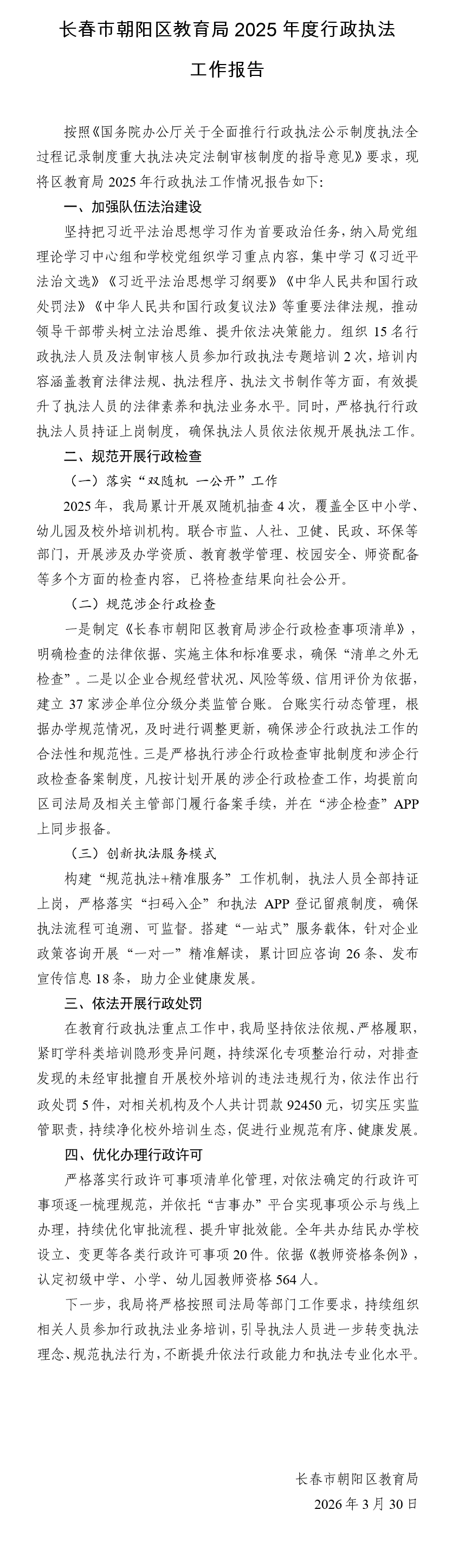 长春市朝阳区教育局2025年度行政执法工作报告
