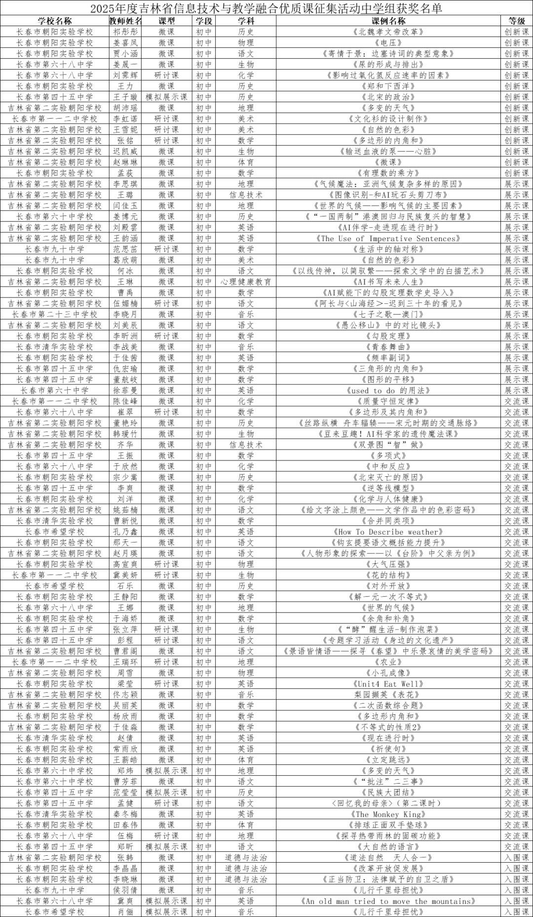 近日,2025年吉林省信息技术与教学融合优质课大赛征集结果正式揭晓,长春市朝阳区再创佳绩——全区260名参赛教师获奖。其中,中小学组71节课获评“创新课”,该奖项的获奖人数与占比均位居全省首位;朝阳区教育局因组织协调工作成效突出,荣获“组织管理创新实践单位”称号。